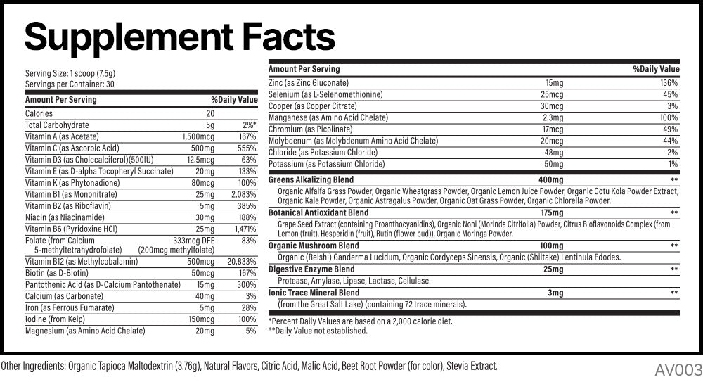 Greens Alkalizing Blend Comprised of all organic ingredients including Wheatgrass, Kale and Chlorella. |